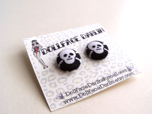 Check out these ghoulish skull fabric earrings, aren’t they adorable?! They are simple, yet elegant, making them the perfect accessory for a party, a night out with the girls or just the perfect bit of flair to wear with t-shirt and jeans! These earrings are made with gold color earring posts and 3/4″ fabric covered buttons.